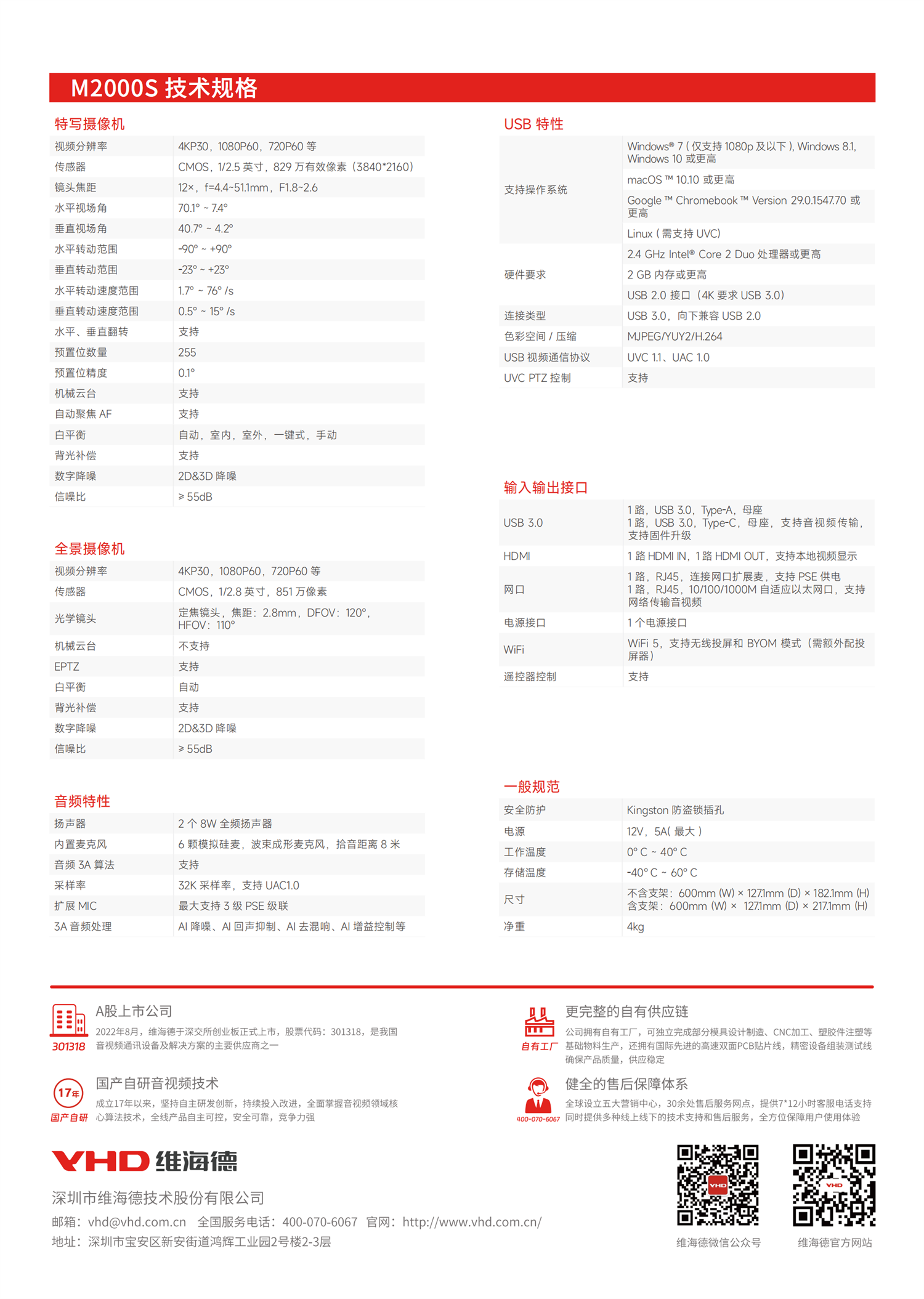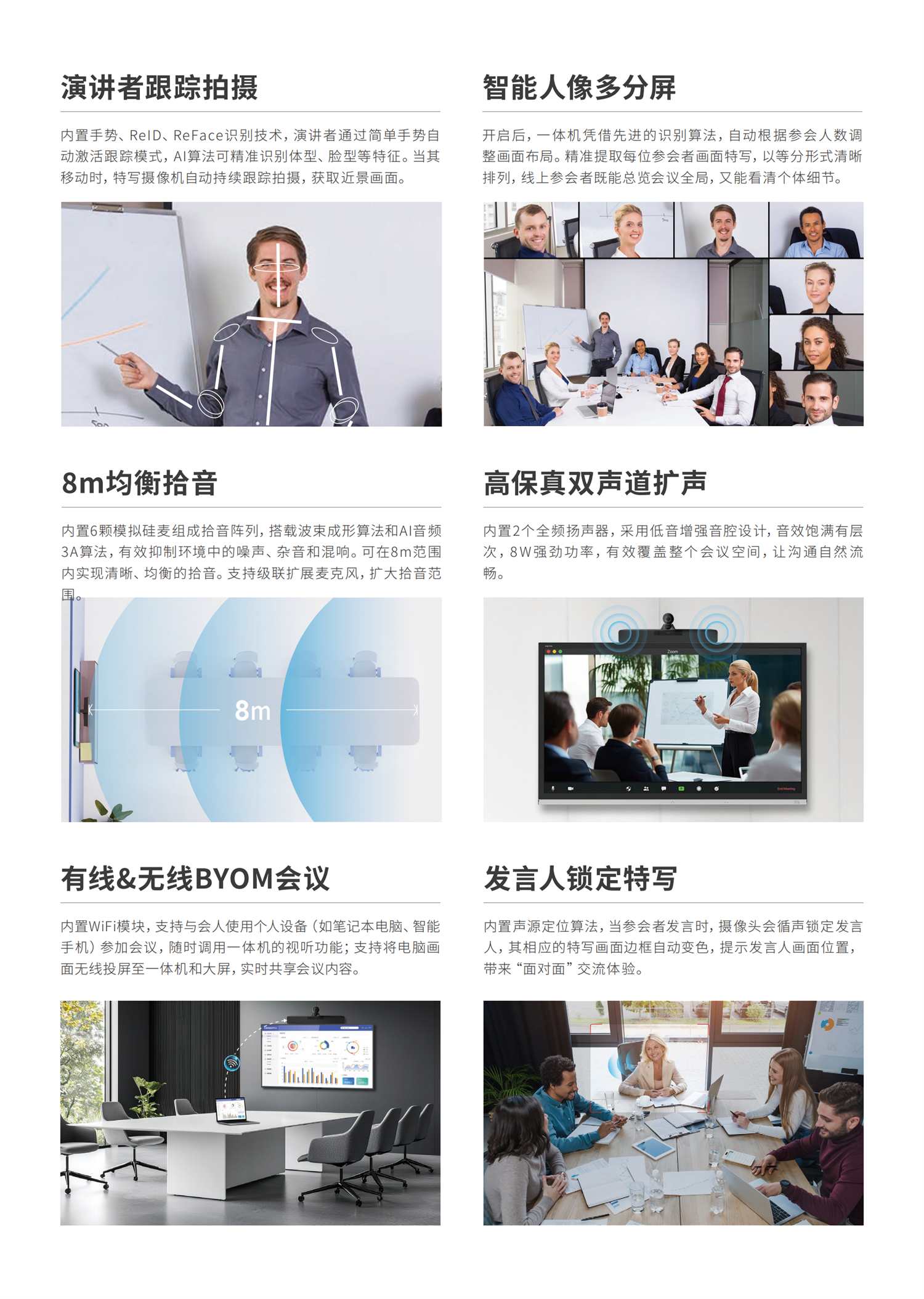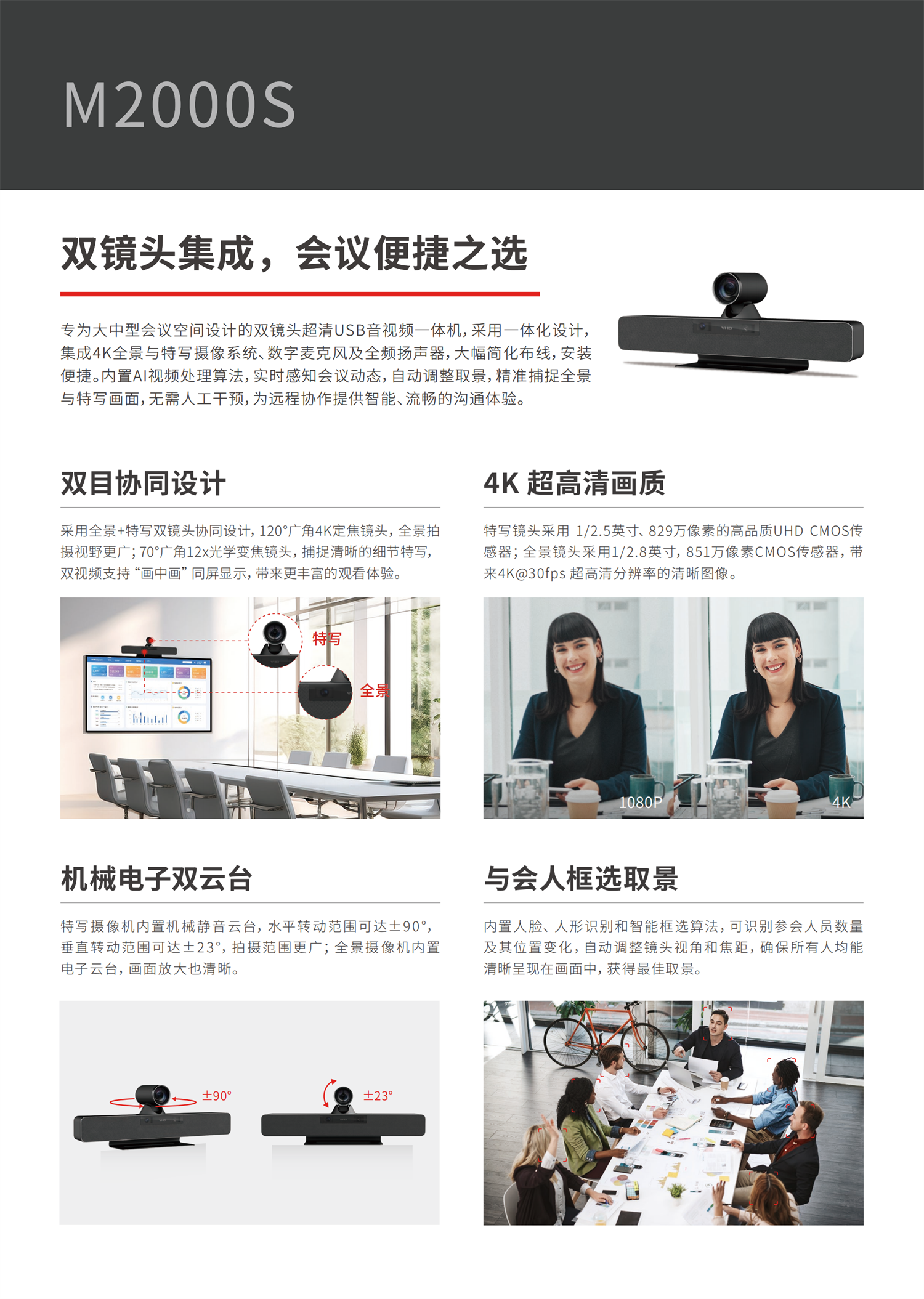 专为大中型会议空间设计的双镜头超清USB音视频一体机,采用一体化设计,集成4K全景与特写摄像系统、数字麦克风及全频扬声器,大幅简化布线,安装便捷。内置AI视频处理算法,实时感知会议动态,自动调整取景,精准捕捉全景与特写画面,无需人工干预,为远程协作提供智能、流畅的沟通体验。